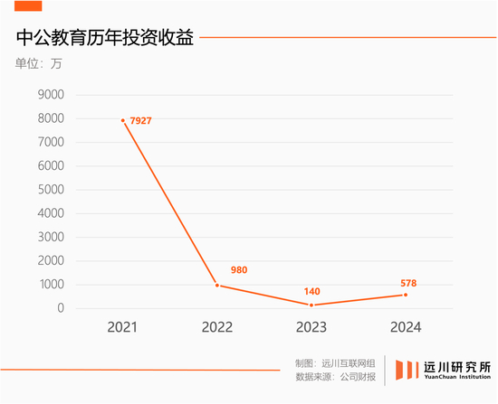2021年,中公教育投资收益7927万,但在近24亿的亏损面前杯水车薪。此后几年理财收益还在光速萎缩,去年中公教育艰难盈利,投资对利润总额的贡献只有两个点。