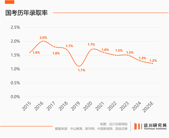 考公市场越火热,中公教育越痛苦。以国考为例,2021年至2024年,国考报名人数翻了近一倍,录取率却从1.6%变成了1.3%,坑位的增速远远落后于萝卜的长势。