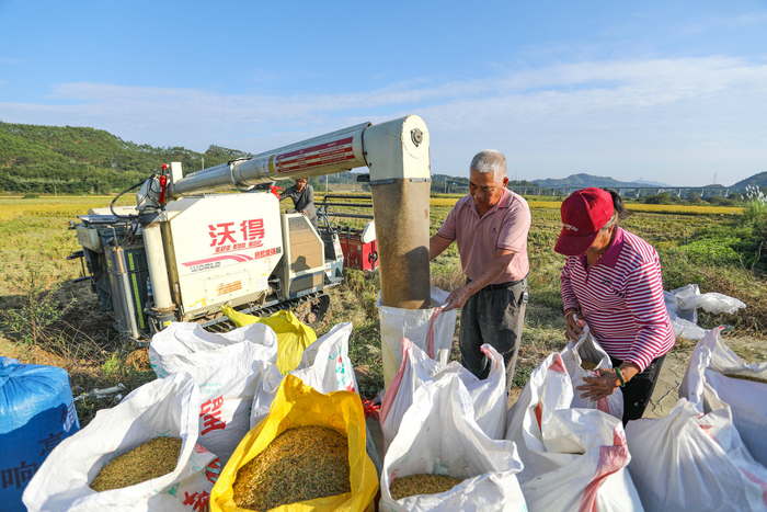 立冬前后,各地的晚稻收割进入尾声。在梧州市万秀区夏郢镇乡村田野,农户们正抢抓晴好天气,忙着开镰收割晚稻,确保稻谷颗粒归仓。 (梧州市纪委监委供 林志清/摄)