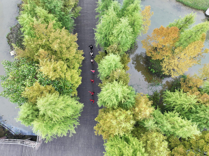 静谧的冬日里,在蒙山县的湿地公园内水杉换上“冬装”,犹如一幅多彩的画卷,人们邀三五好友在树下舞蹈,治愈又浪漫。(蒙山县纪委监委供 钟德献/摄)
