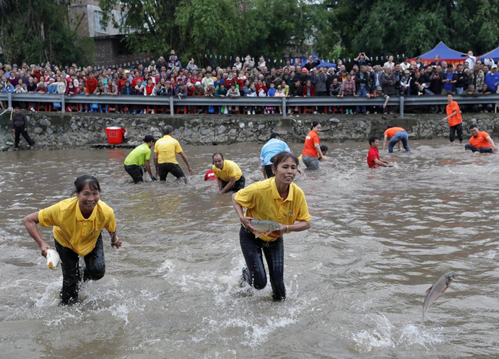 立冬时节,扶绥县柳桥镇坡利村第十届鱼米节活动如火如荼举行,通过评比“星级文明户”“种粮能手”、民俗演出、非遗展示、抓鱼比赛等活动庆祝丰收。图为群众抓鱼比赛。(扶绥县纪委监委供 许精韬/摄)