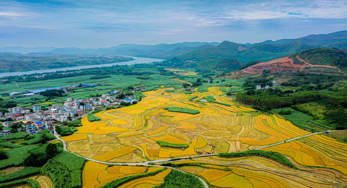 立冬至,乡村“丰”景如画。柳州市鱼峰区白沙镇新安村大田头屯,金黄色的稻田与村居、道路、青山、河流相映成景,构成一幅美丽的田园丰收图景。(柳州市鱼峰区纪委监委 蔡继青/摄)