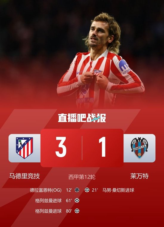 直播吧11月9日讯 北京时间11月9日凌晨1时30分,2025-26赛季西甲第12轮在利雅得航空大都会球场展开角逐,马德里竞技主场迎战莱万特。上半场巴里奥斯传中造乌龙,马竞防守漏人致丢球,下半场格列兹曼替补梅开二度。最终马竞主场3-1战胜莱万特,马竞取得联赛4连胜+11轮不败,先赛距榜首皇马5分。