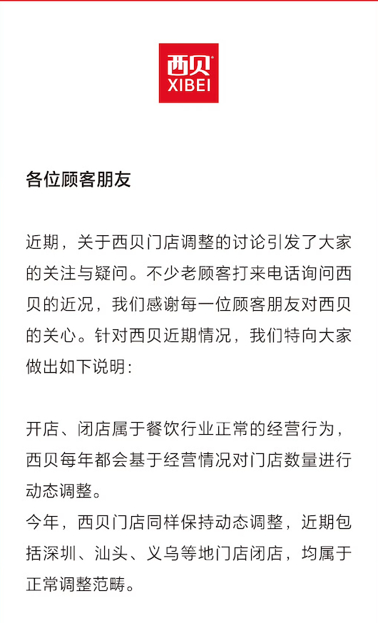 11月11日,西贝通过官方微博回应称,开店、闭店属于餐饮行业正常的经营行为,西贝每年都会基于经营情况对门店数量进行动态调整。今年西贝门店同样保持动态调整,近期包括深圳、汕头、义乌等地门店闭店,均属于正常调整范畴。
