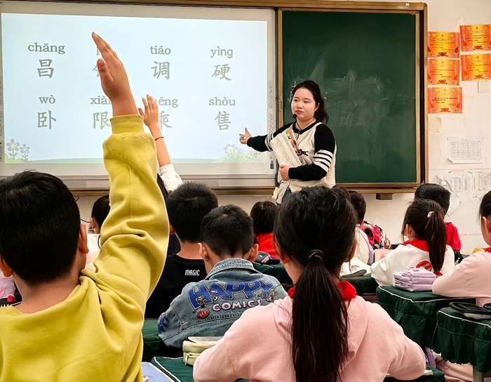 杨柳湖学校教师张思奇:学校创新推出了“拼音闯关大冒险”课间游戏,把声母、韵母、整体认读音节设为“闯关的密码”,学生用双脚跳出拼音造型,配合声调律动,在欢笑声中就攻克了平翘舌音难点,他们通过跳跃、认读、组词完成了知识的巩固。一些以前比较内向的孩子现在主动牵头组队去闯关,孩子们在课堂上发言也积极了。