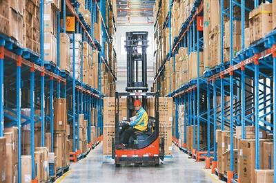 11月11日,位于山东省青岛市李沧区世园街道的苏宁物流中心,叉车工进行出货作业,应对“双11”电商订单物流高峰。张 鹰摄(人民视觉)