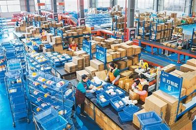 11月11日,安徽省芜湖市繁昌区峨山镇的一家物流产业园内,工作人员在分拣、打包“双11”快递包裹。肖本祥摄(人民视觉)