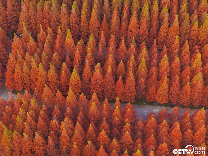 11月14日,山东日照,海滨国家森林公园,千亩水杉林迎来最佳观赏期,翠绿枝叶渐变晕染成暖糯焦糖色,宛如大自然打翻的调色盘,勾勒出初冬限定的油画秘境。