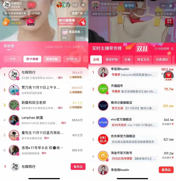 据相关媒体消息,头部MCN、主播均未发布“双十一”战报。而据界面新闻观察,截至今双十一当日12:30,抖音“双十一”热卖榜单中第一名为“与辉同行”,第二名为贾乃亮账号,第三名则为“新疆和田玉老郑”;淘宝直播主播带货总榜中,李佳琦账号位居第一,第二名为天猫超市,第三则为雅诗兰黛旗舰店。