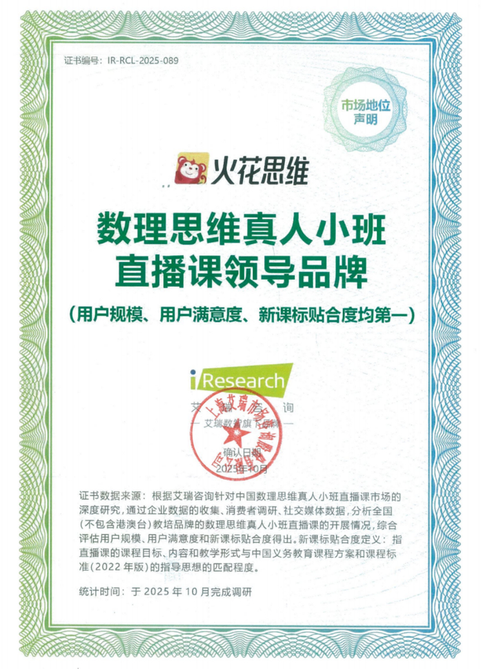 2025年10月,基于艾瑞咨询全国少儿数理思维培训行业专项调研,火花思维获得“数理思维真人小班直播课领导品牌”市场地位声明证书。通过专家访谈、用户定量研究等多维度验证调研,认证火花思维在用户规模、用户满意度和新课标贴合度三大核心指标上均位居行业榜首。